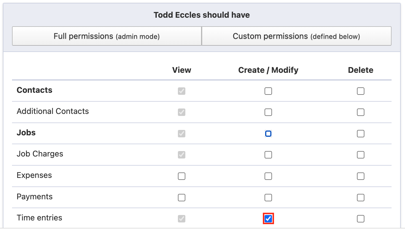 - Check to see that they have Time entries selected under Create / Modify. This allows a user to clock in and out of a Job. Alternatively, a user with Full permissions (admin mode) will be able to do this and more.