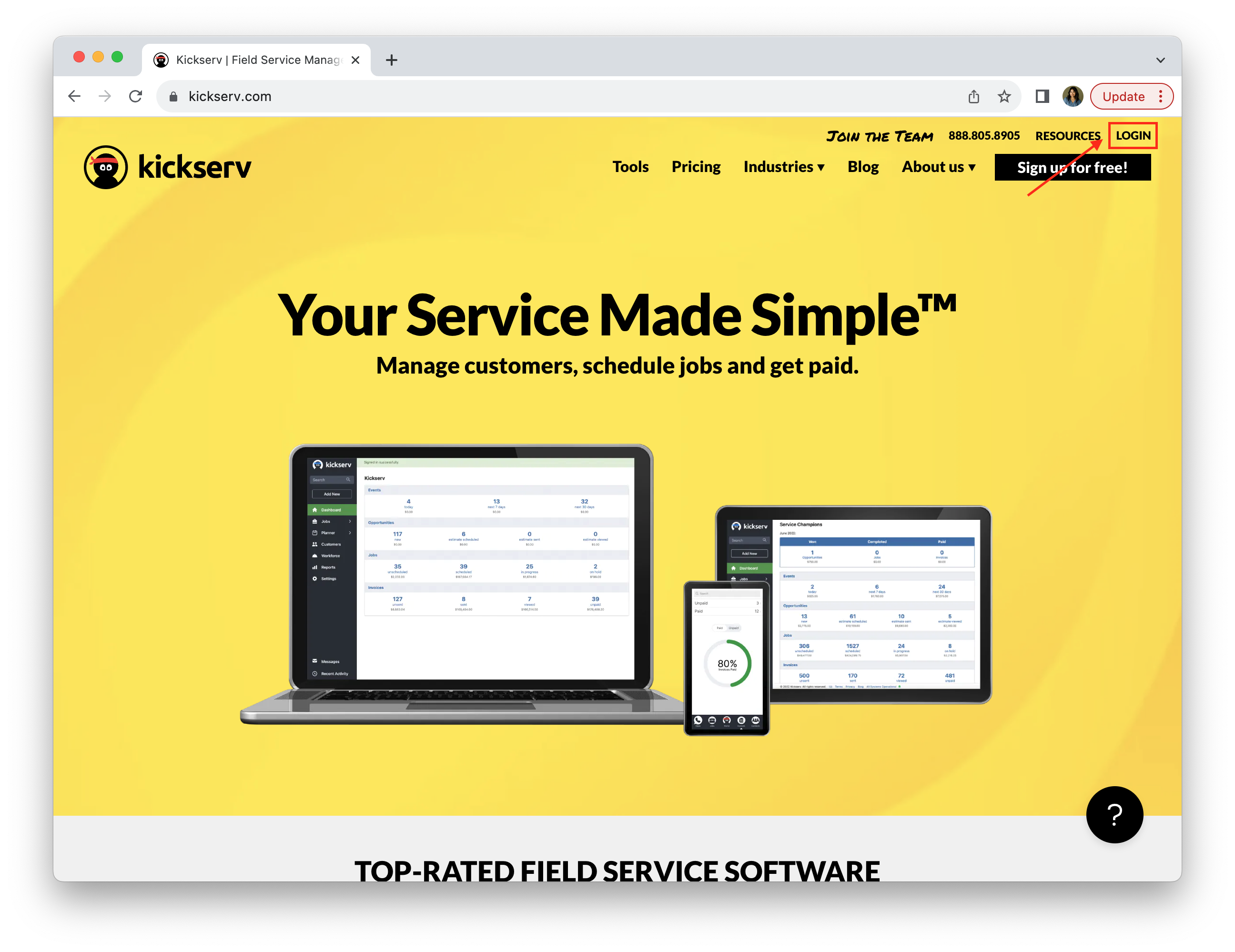 Go to kickserv.com, then select LOGIN in the top right corner.