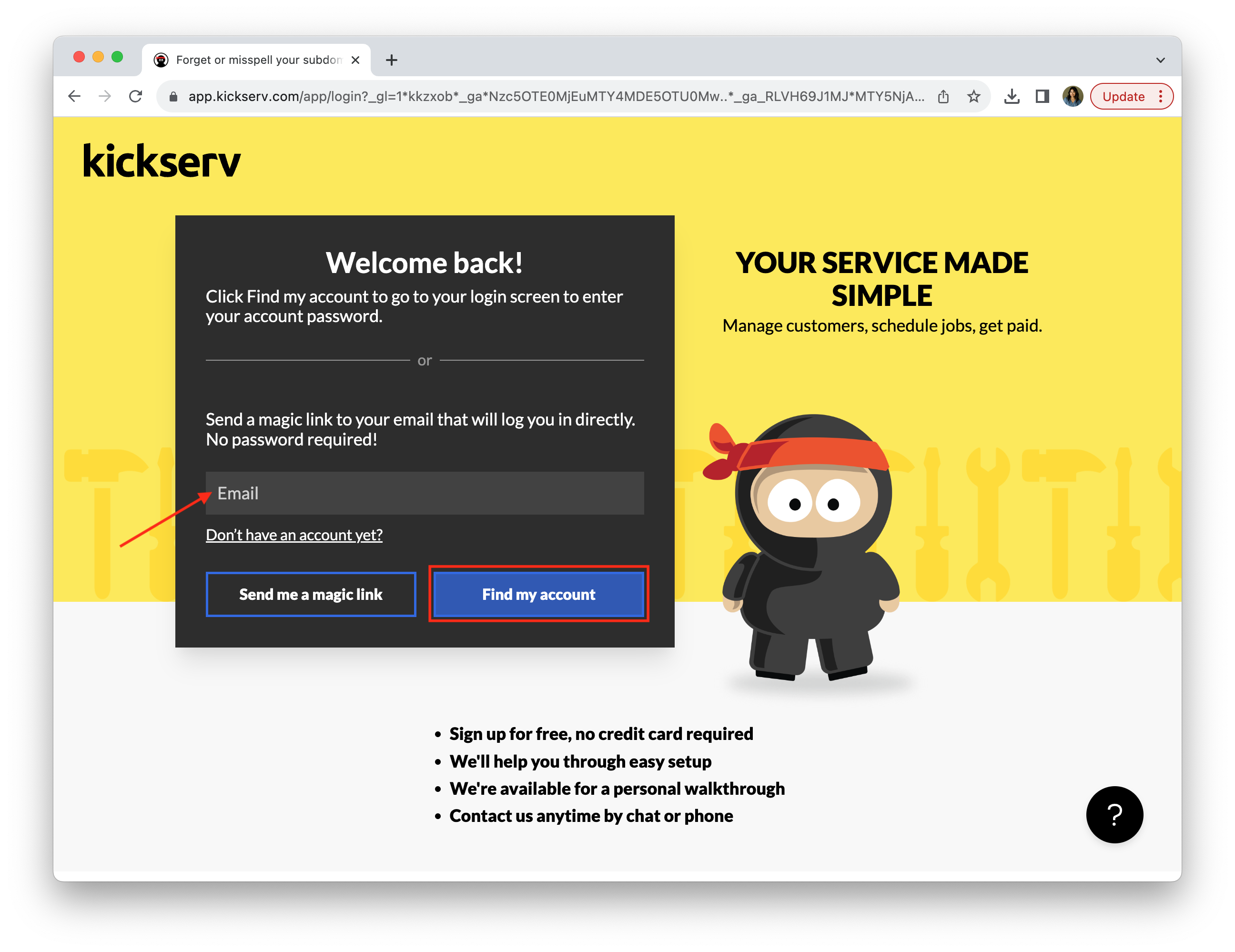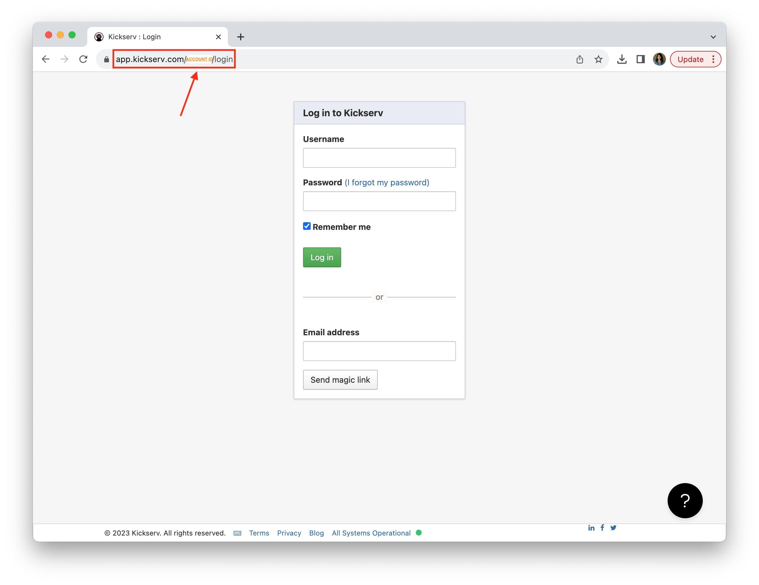In the web address bar, you will see https://app.kickserv.com/ACCOUNTID/login. In between "kickserv.com" and "login" is your account ID.