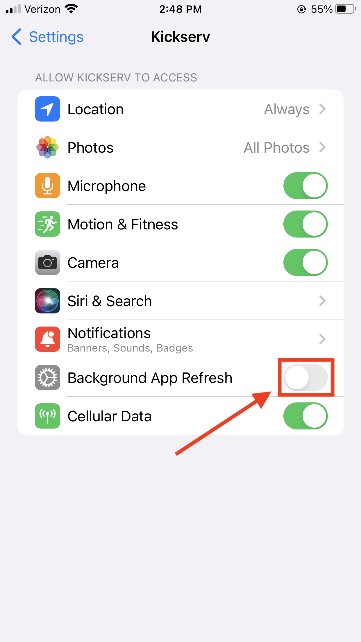 - Select Kickserv. You will have a list of permissions enabled for the Kickserv app. Locate Background App Refresh.