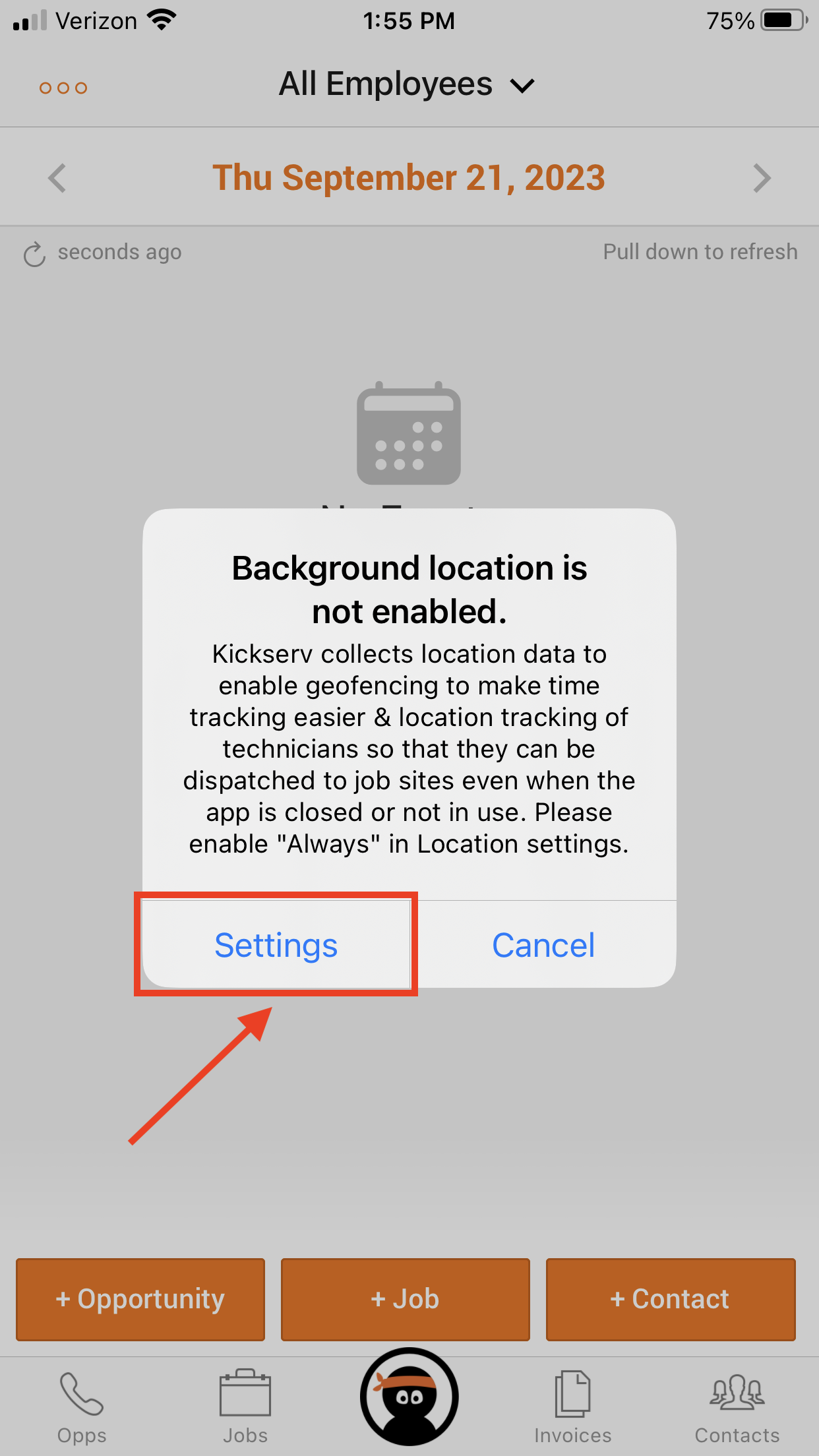 Note: Make sure to enable “Always” in Location settings for Kickserv to turn on time and location tracking.