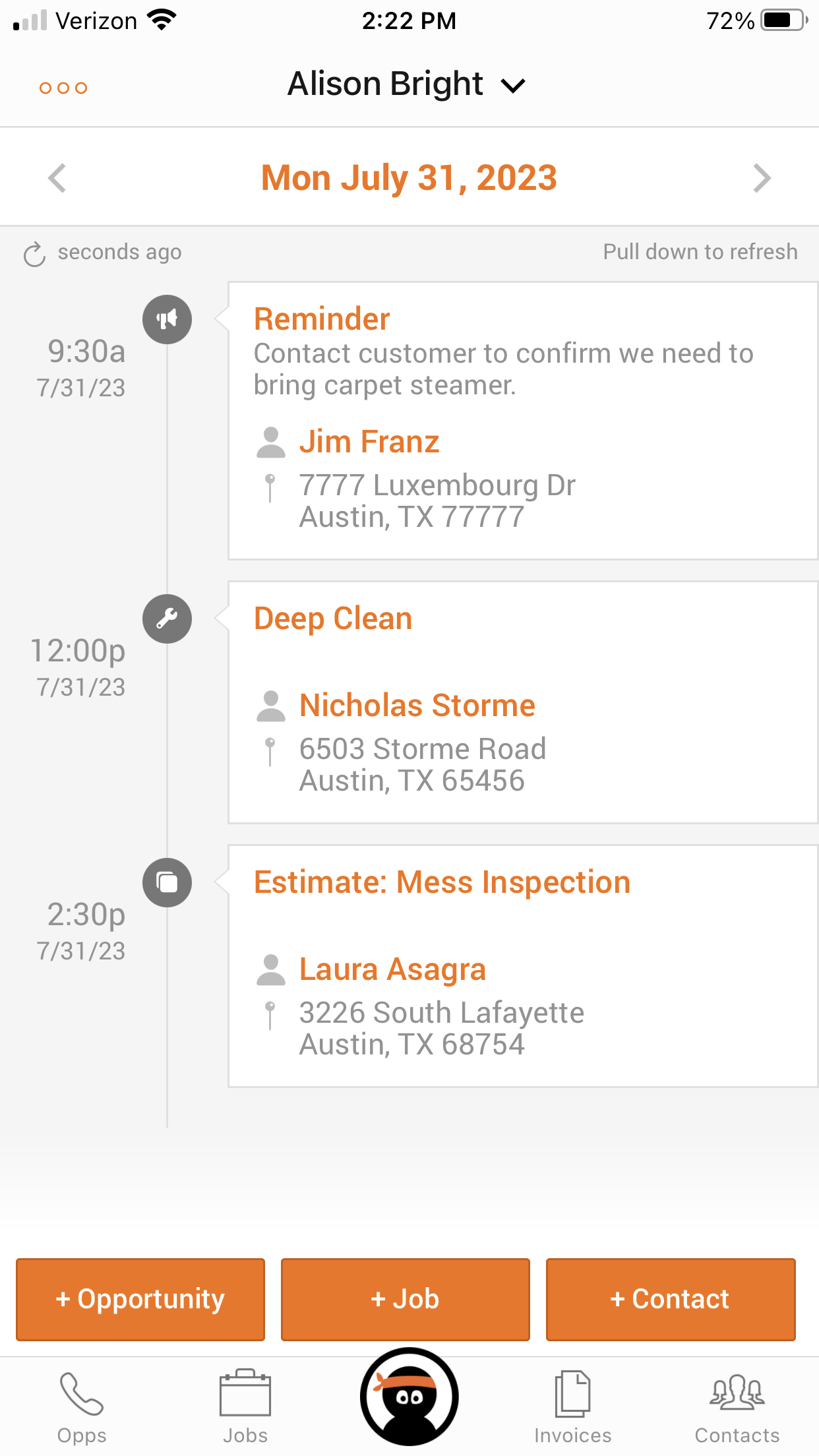 - On the home screen, you will see your full schedule for the day. The wrench icon represents a work event, the clipboard icon represents an estimate event, and the megaphone icon is a reminder (for technicians, not for customers).