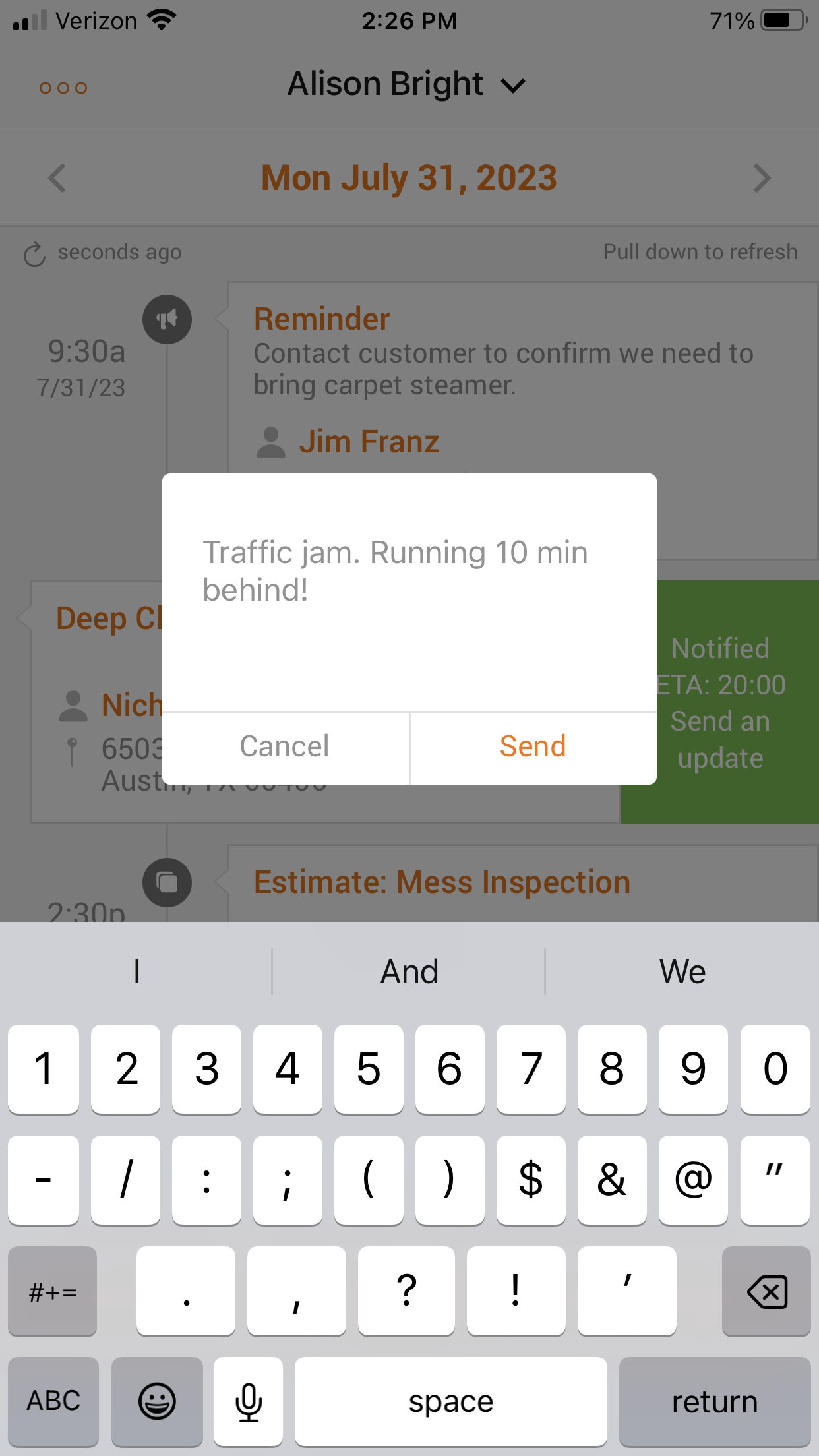 Swipe left on a job from your home screen to reveal the Notify button. Tap this button to alert the customer that you are on the way (OTW) to the event location.