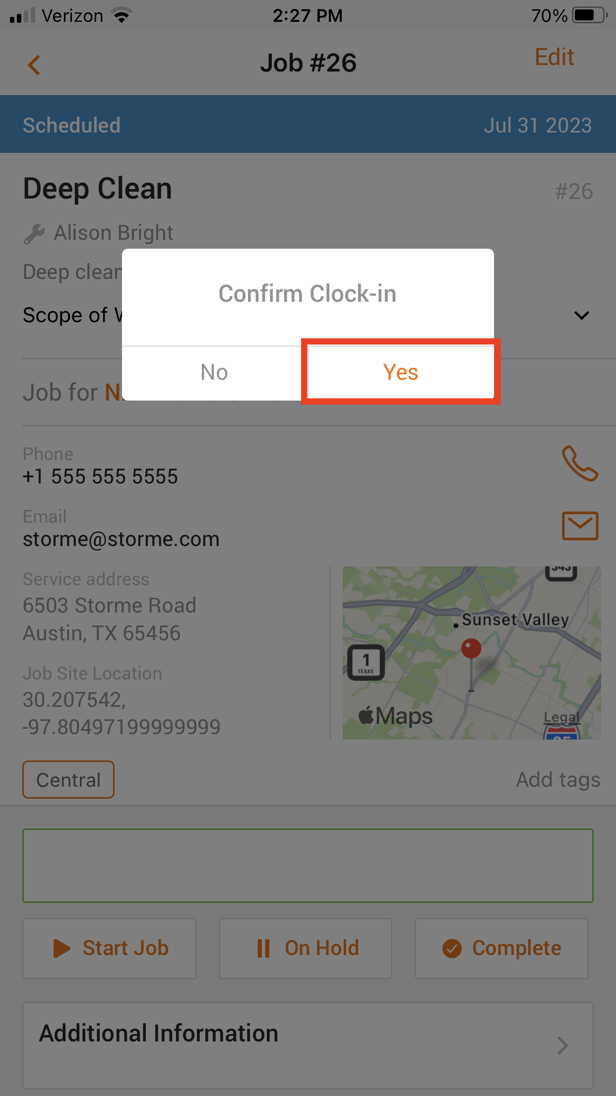 To track your time, tap the Clock In button in the middle of the screen. Tap Yes to confirm your clock-in and start the timer.