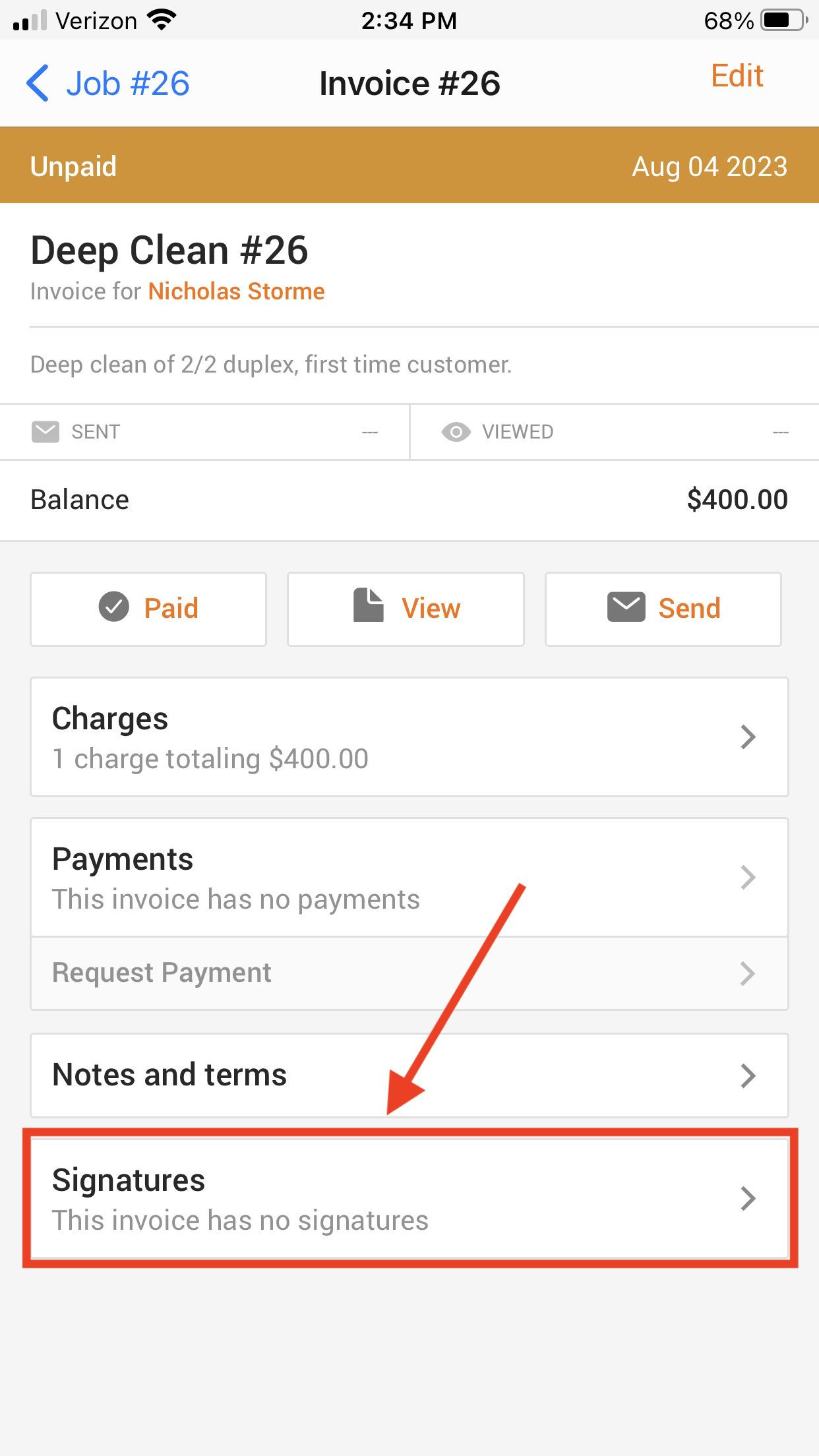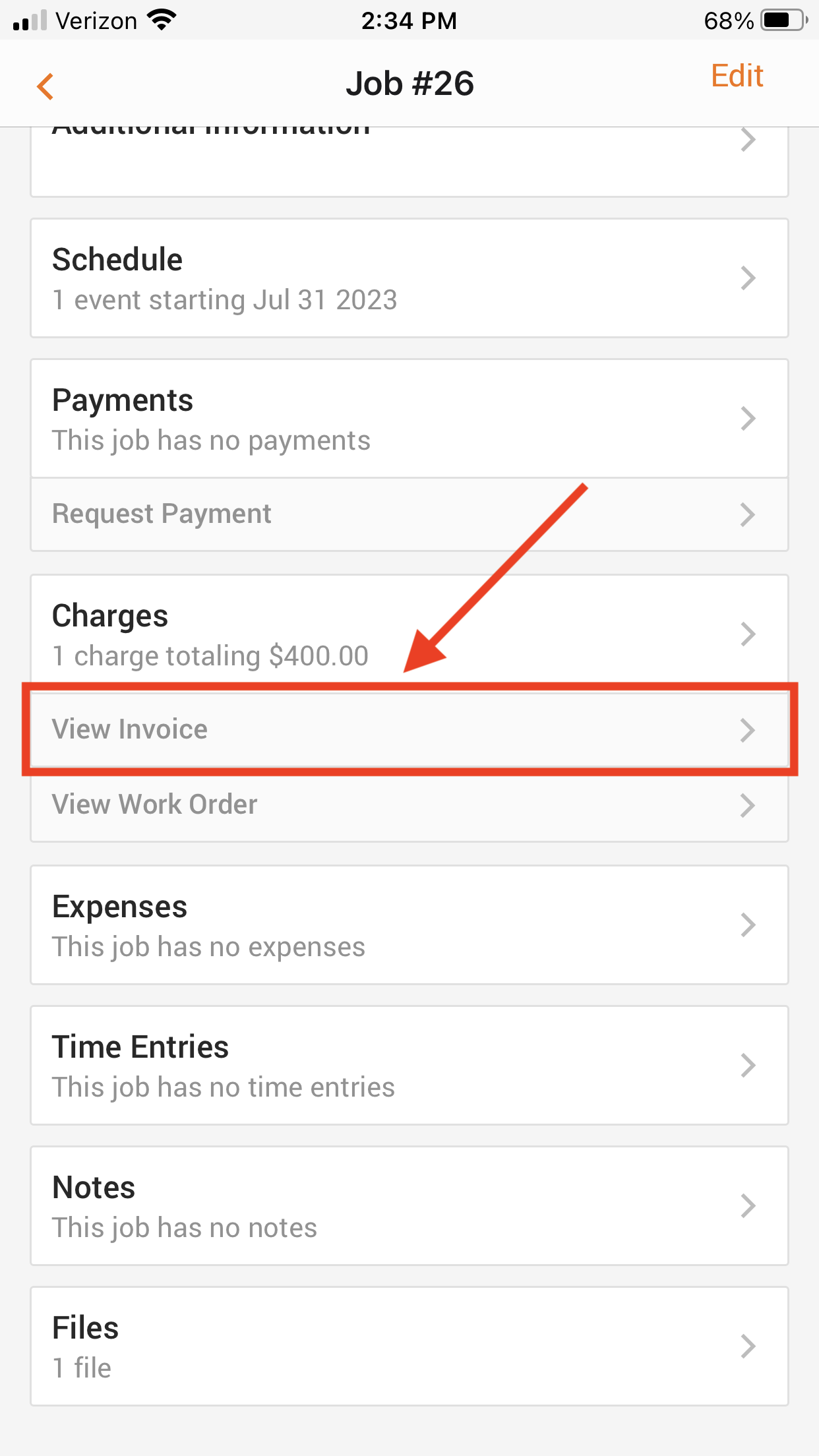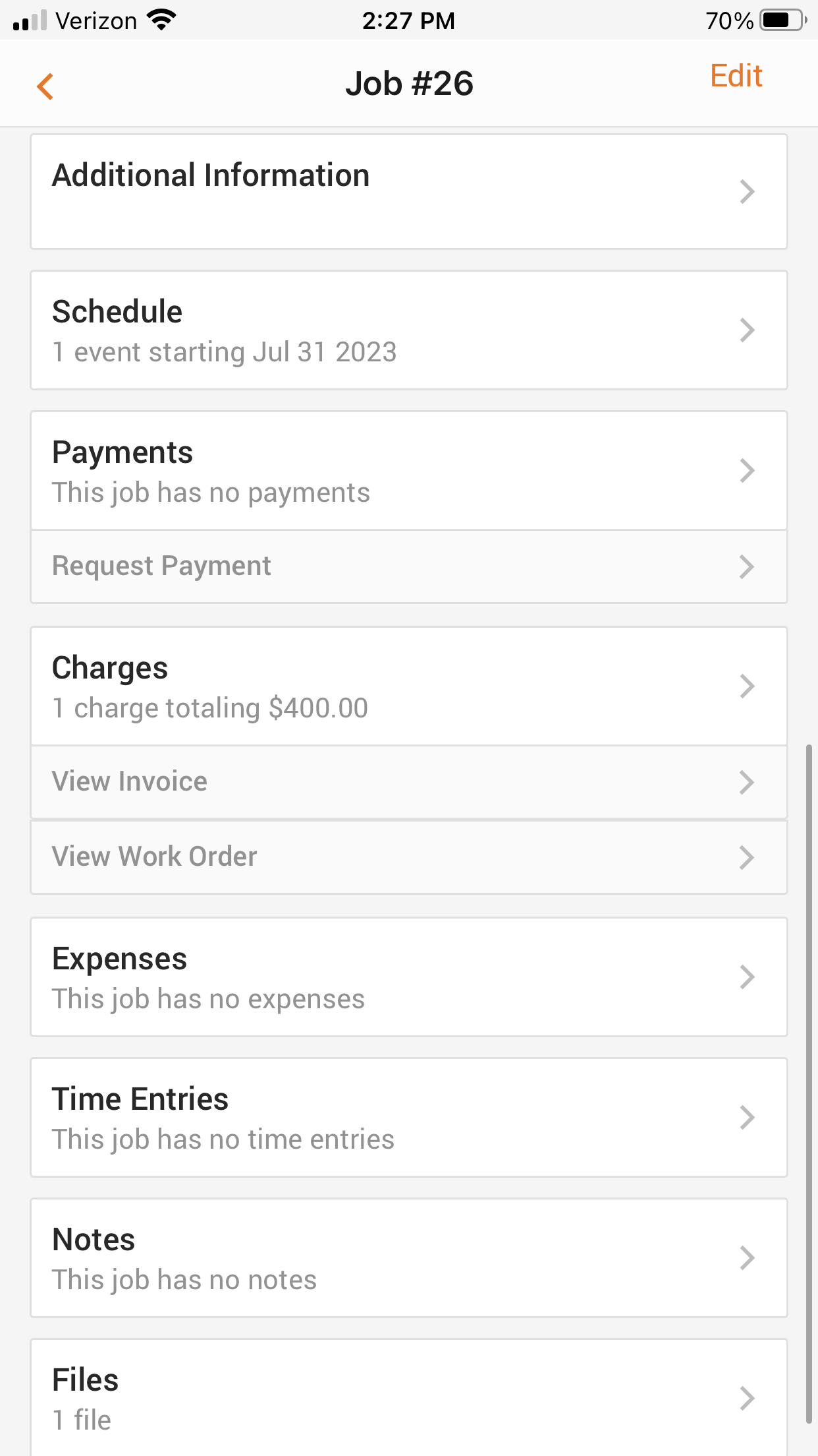You’ll have all the information you need to complete the job. If needed, you can add charges, expenses, time entries, notes, and attachments by tapping on the designated option, then the + icon.