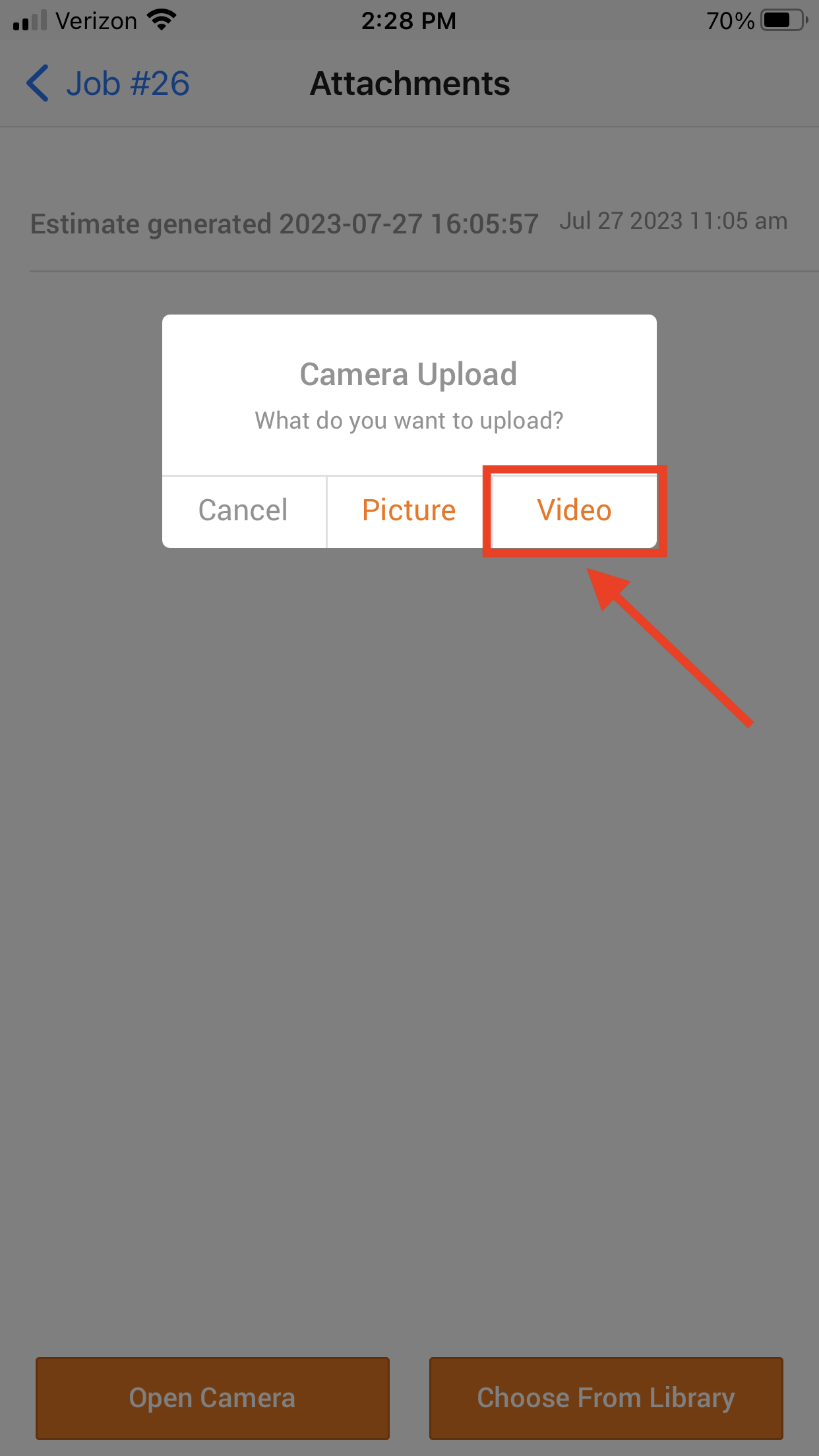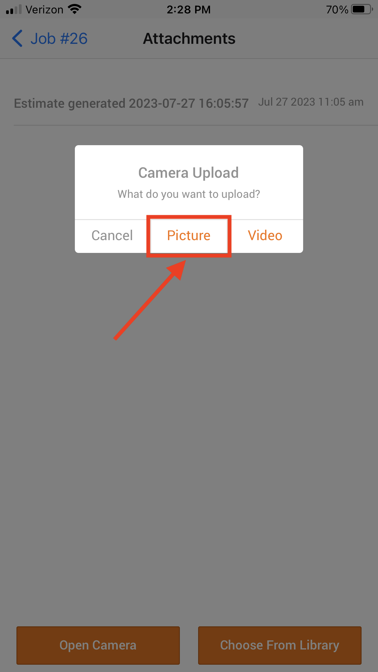 A Camera Upload pop-up will appear. Choose the Picture option.
