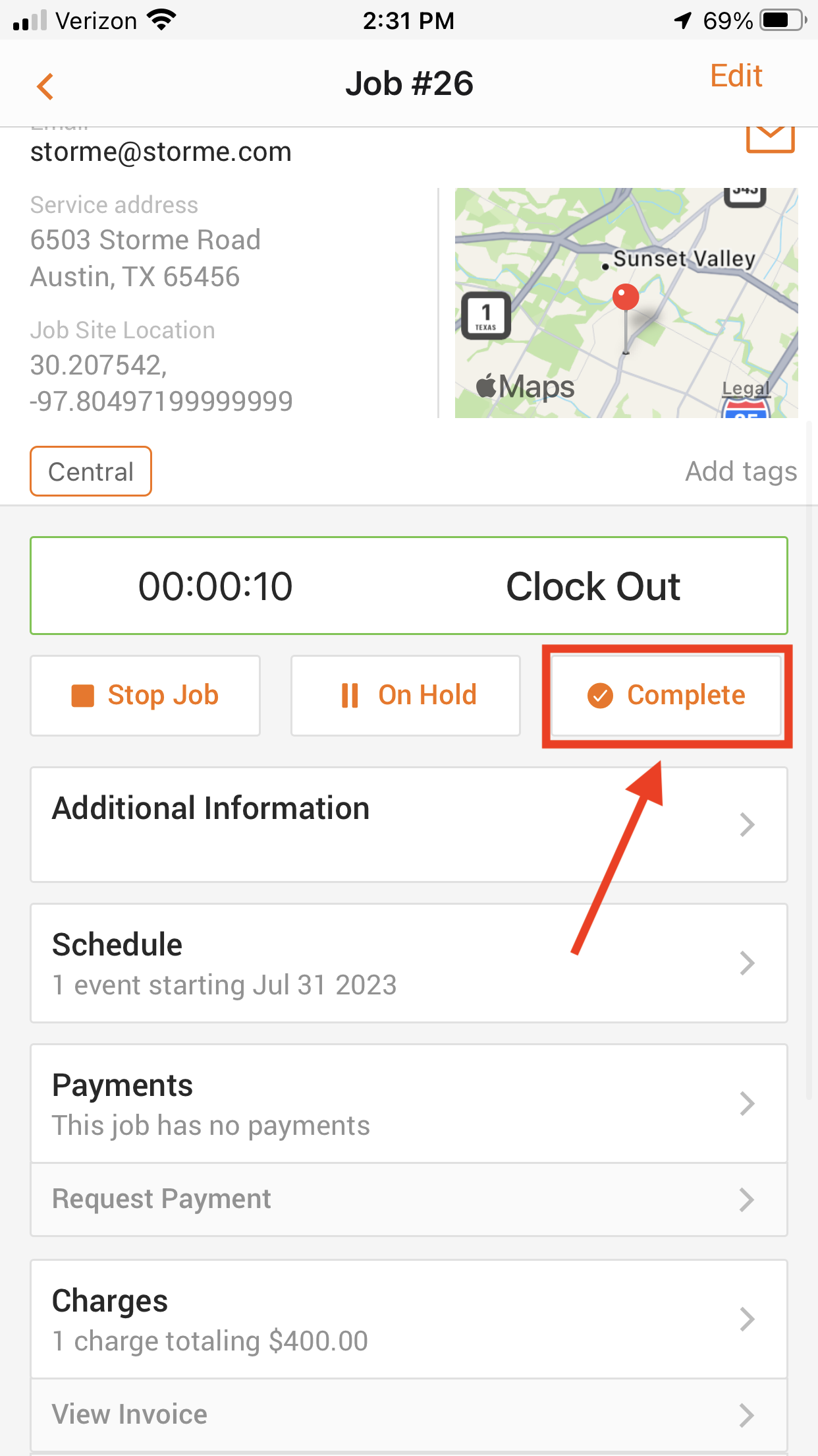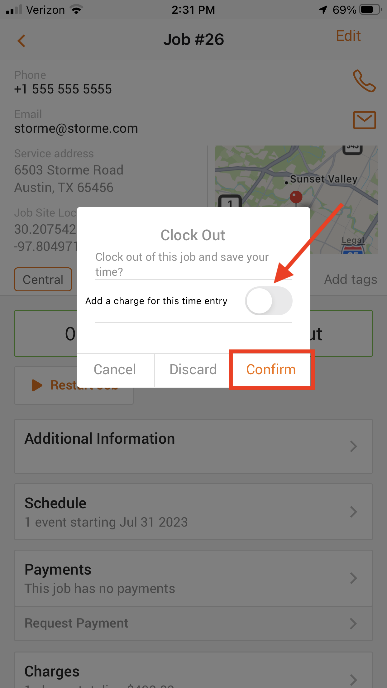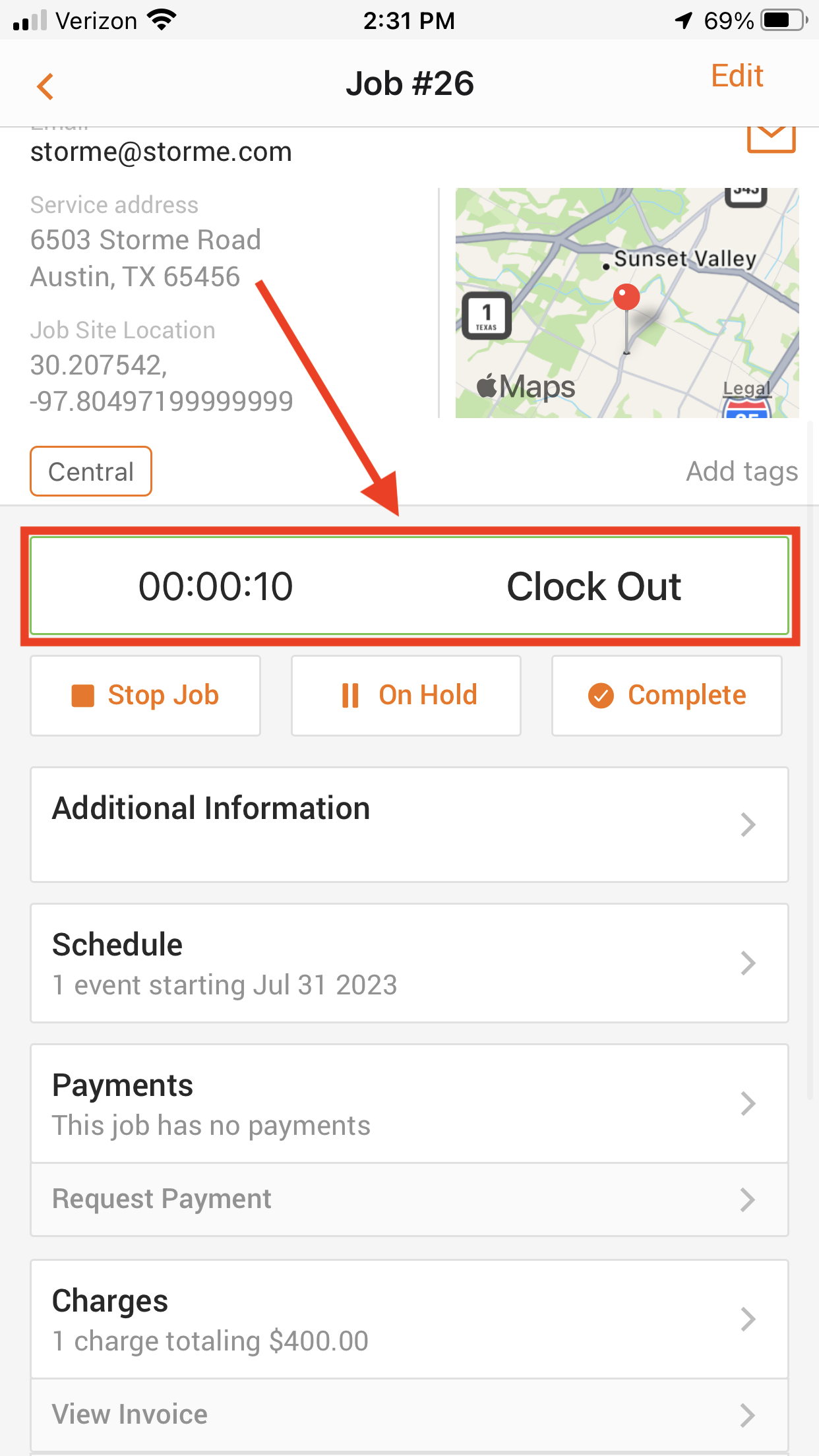 Then, tap Clock Out to end your work time on that event. You will have the option to add your hours to the job as a charge item.