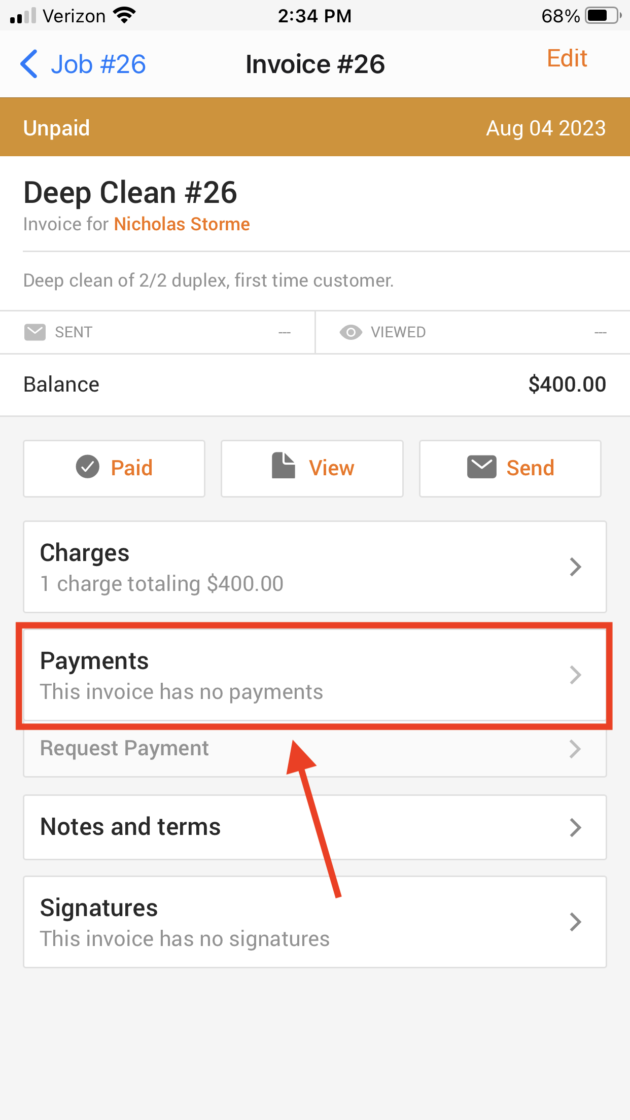 - Tap Payments to send a payment request to the customer, which will be completed via Stripe.