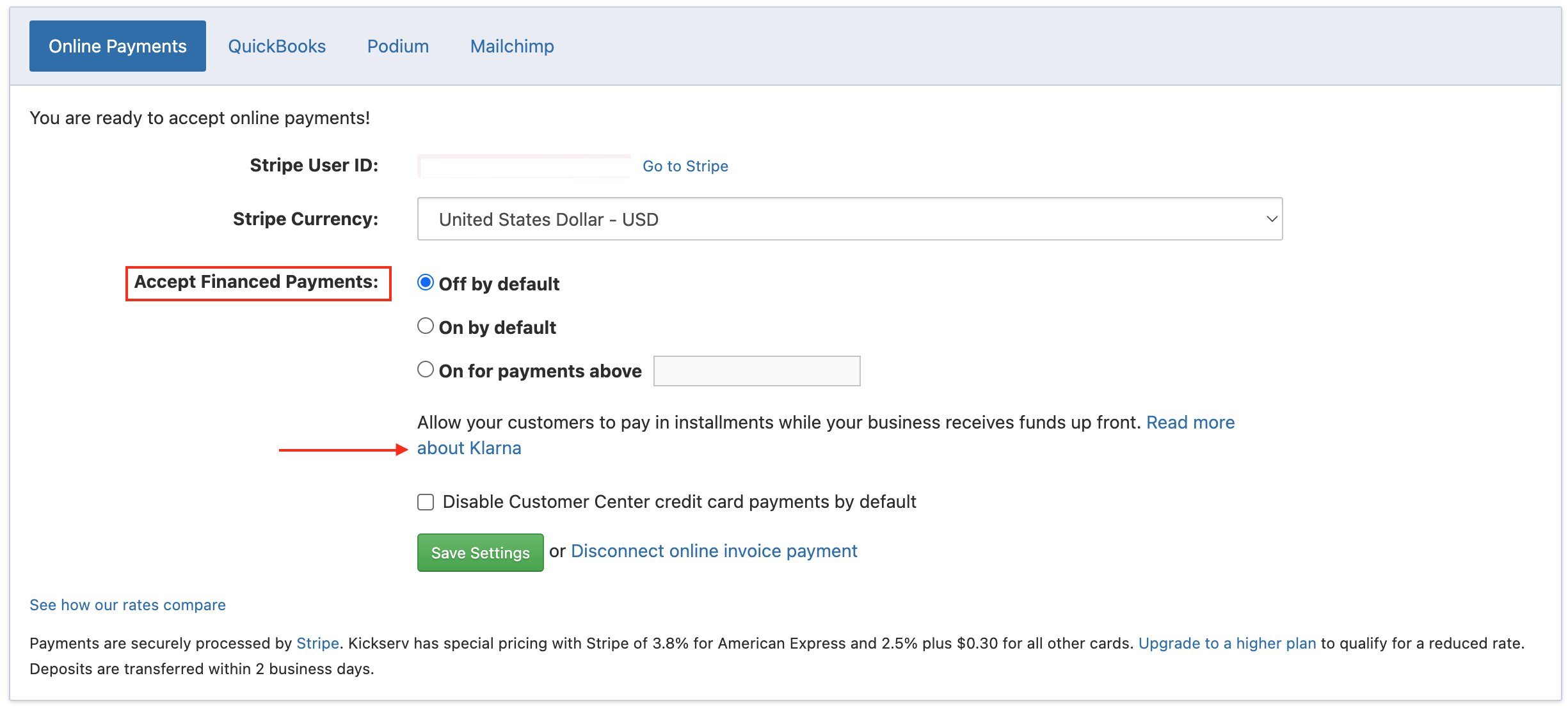 - Under the Online Payments tab, navigate to the Accept Financed Payments section.