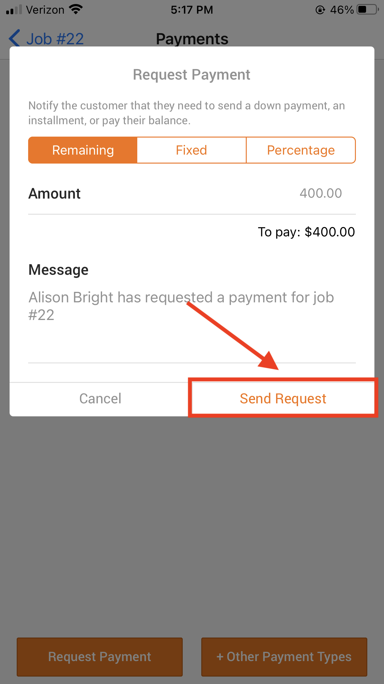 - You have the option to request the remaining balance, a fixed amount, or a percentage. Make your selection, update the message (optional), then hit Send Request.