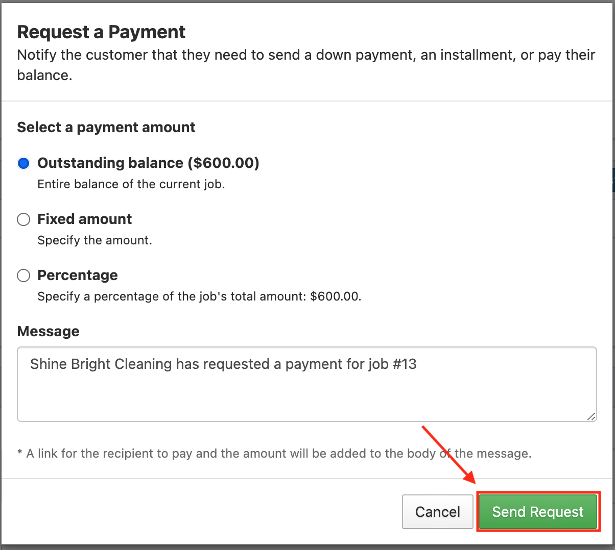 - You have the option to request the remaining balance, a fixed amount, or a percentage. Make your selection, update the message (optional), then select the Send Request button.