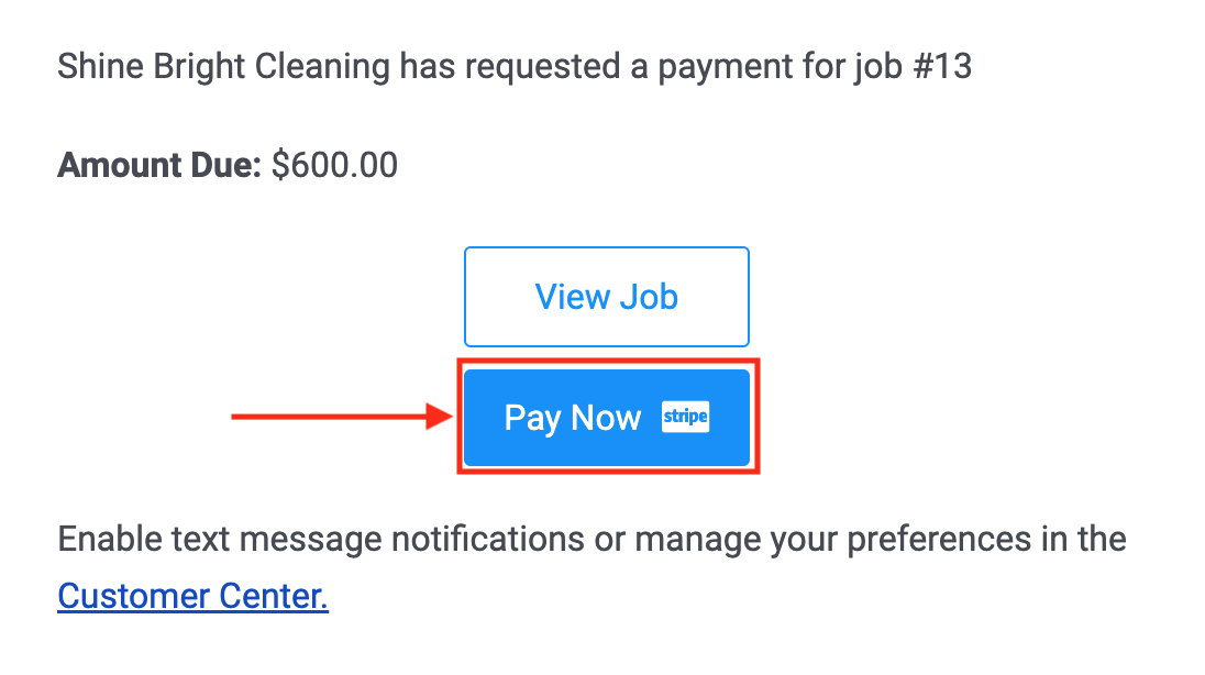 Your customer will receive the payment request via email and text message (if enabled). They can complete the request by selecting the Pay now link on their phone or in their email. They also have the option to review the Job by selecting that link instead.
