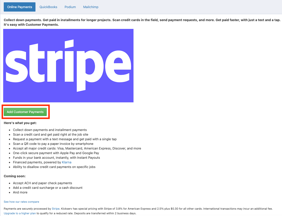 Accepting credit cards is simple with Kickserv’s Stripe integration. Stripe is a leading provider of simple credit card payments on web and mobile. Once you've created an account with Stripe and linked it to Kickserv, your customers will be able to pay directly from their invoice or from the Customer Center. You'll even be able to take payments on-site directly from the Kickserv app, right on your mobile device.