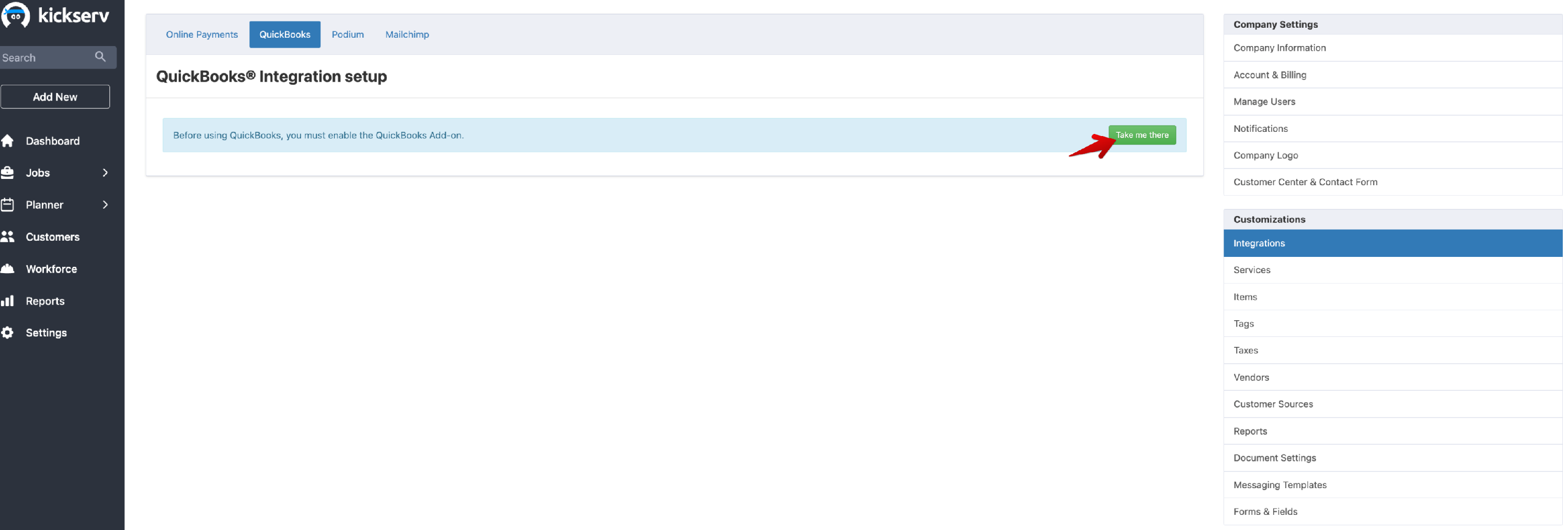- Once back in Kickserv, return to Settings —> Integrations —> then the QuickBooks tab.