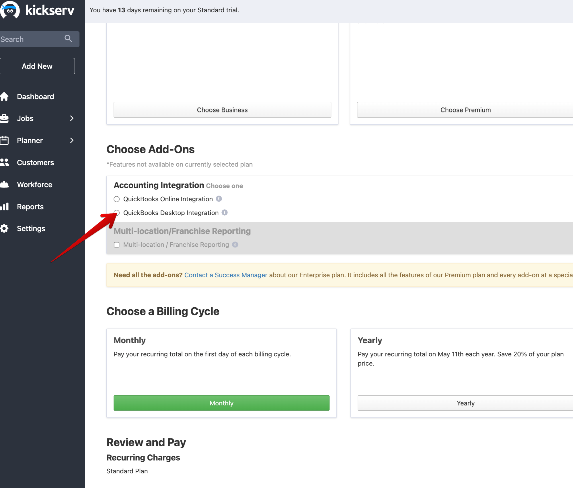 Note: Before you can begin the set up for Quickbooks® Desktop synchronization, you will need to enable the add-on to your Kickserv account. The cost to maintain a sync to QuickBooks® desktop is $50/month or $480/year.