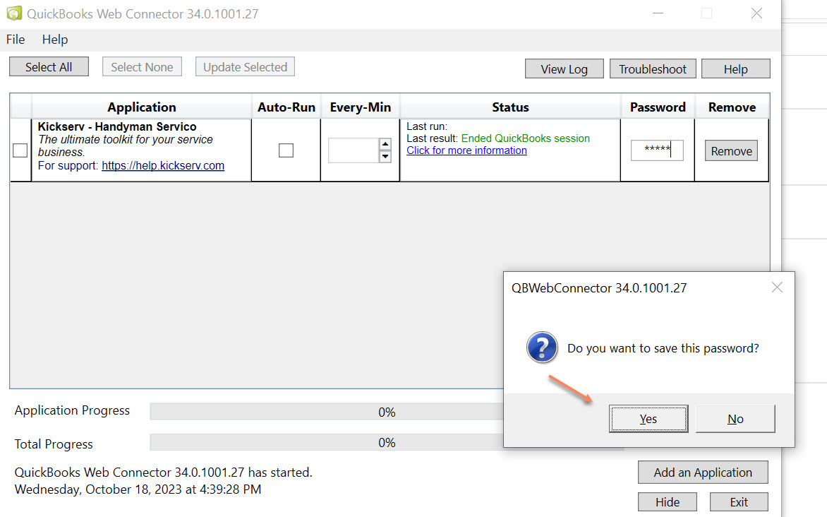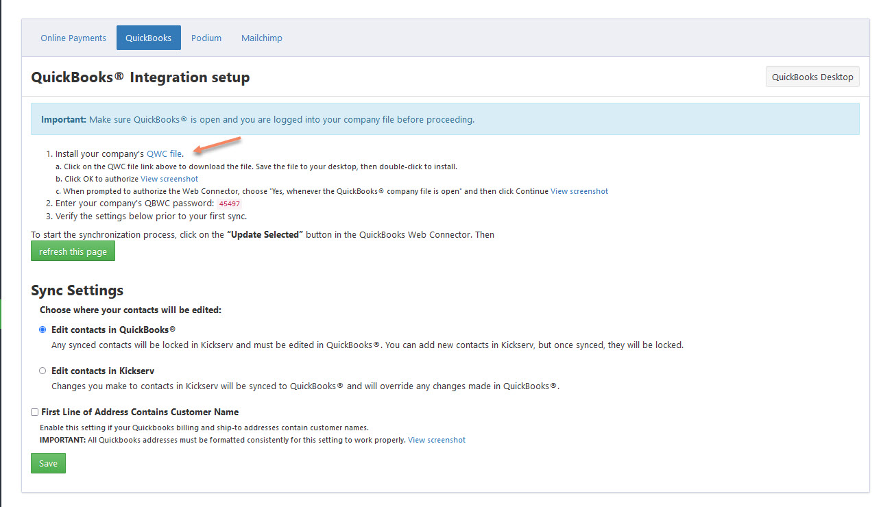 - Follow Step 1, and click on QWC file to install the Kickserv application to your web connector.