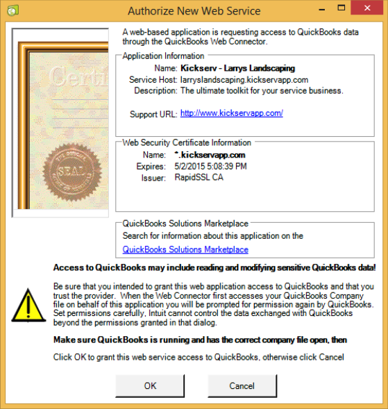 - When asked to authorize Kickserv, select OK.