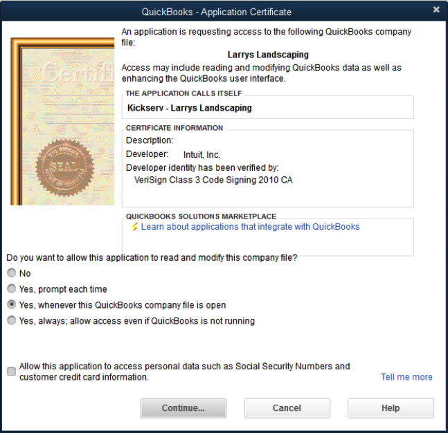 - When asked if you want to allow this application to read and modify the company file, choose Yes, whenever this QuickBooks company file is open. Then select Continue.