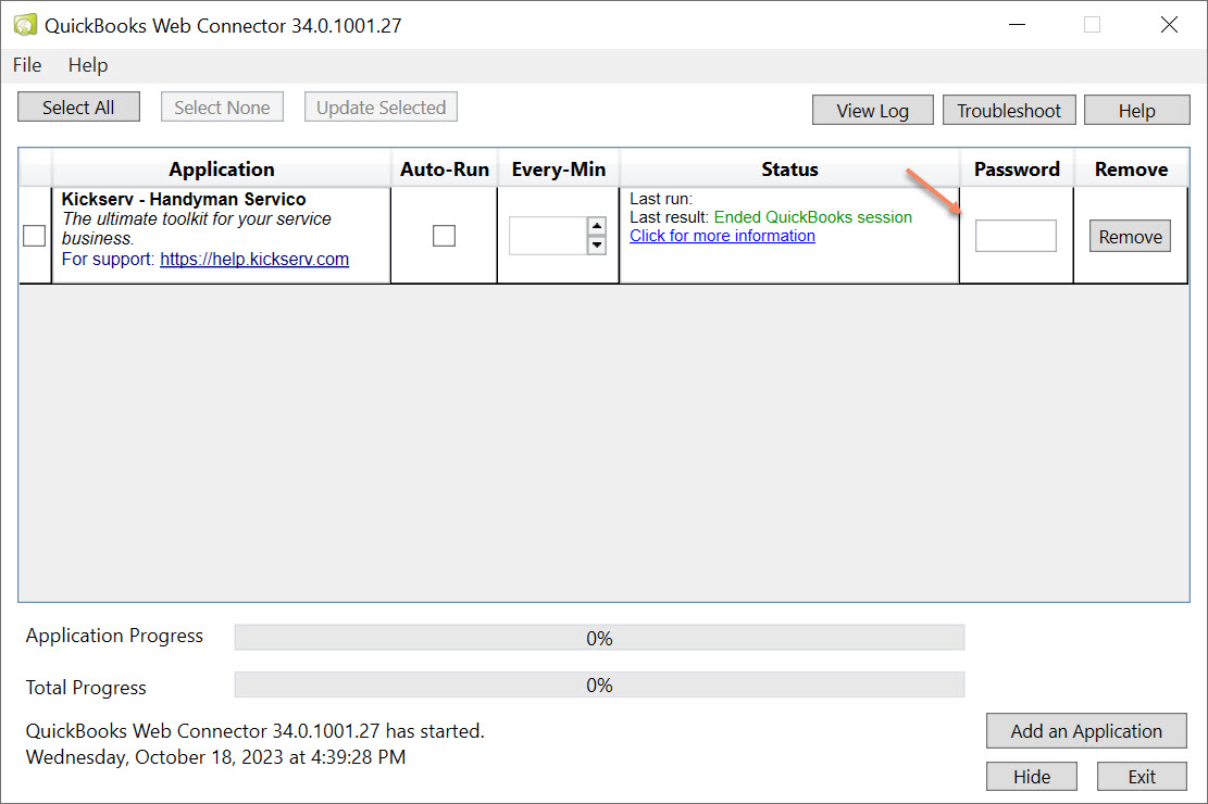 12. Follow Step 2, and fill in the password field with the password from the Kickserv QuickBooks integration page.