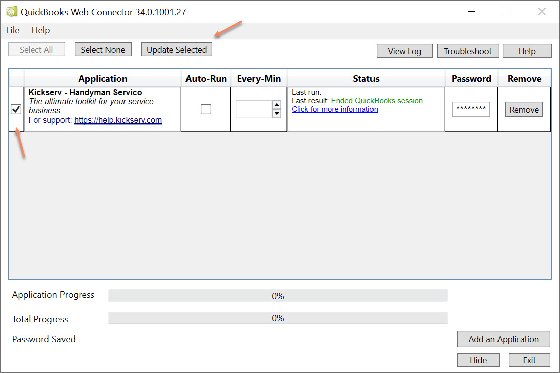 14. Check the box next to your Kickserv application, then select Update Selected. The sync to Kickserv will now run.