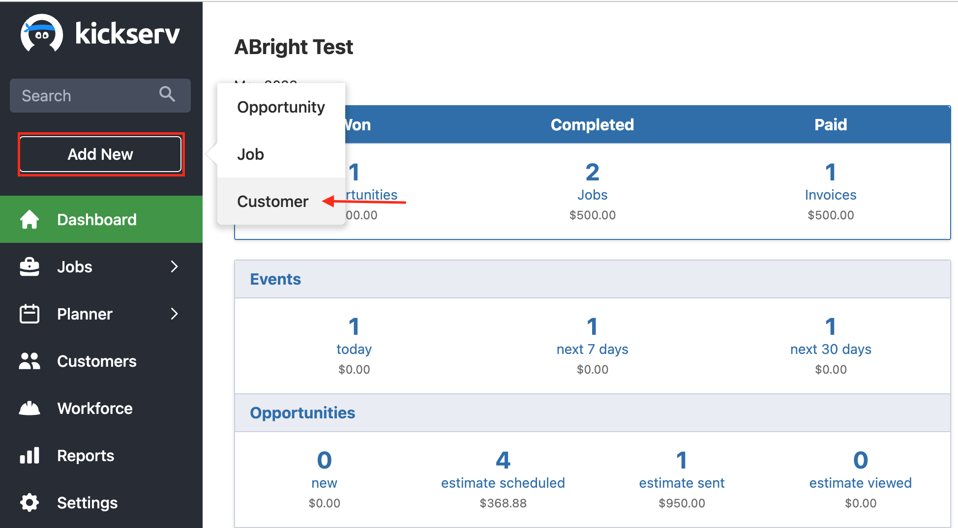 To create a new customer from any page, select the Add New button in the Kickserv navigation bar. Then, select Customer.