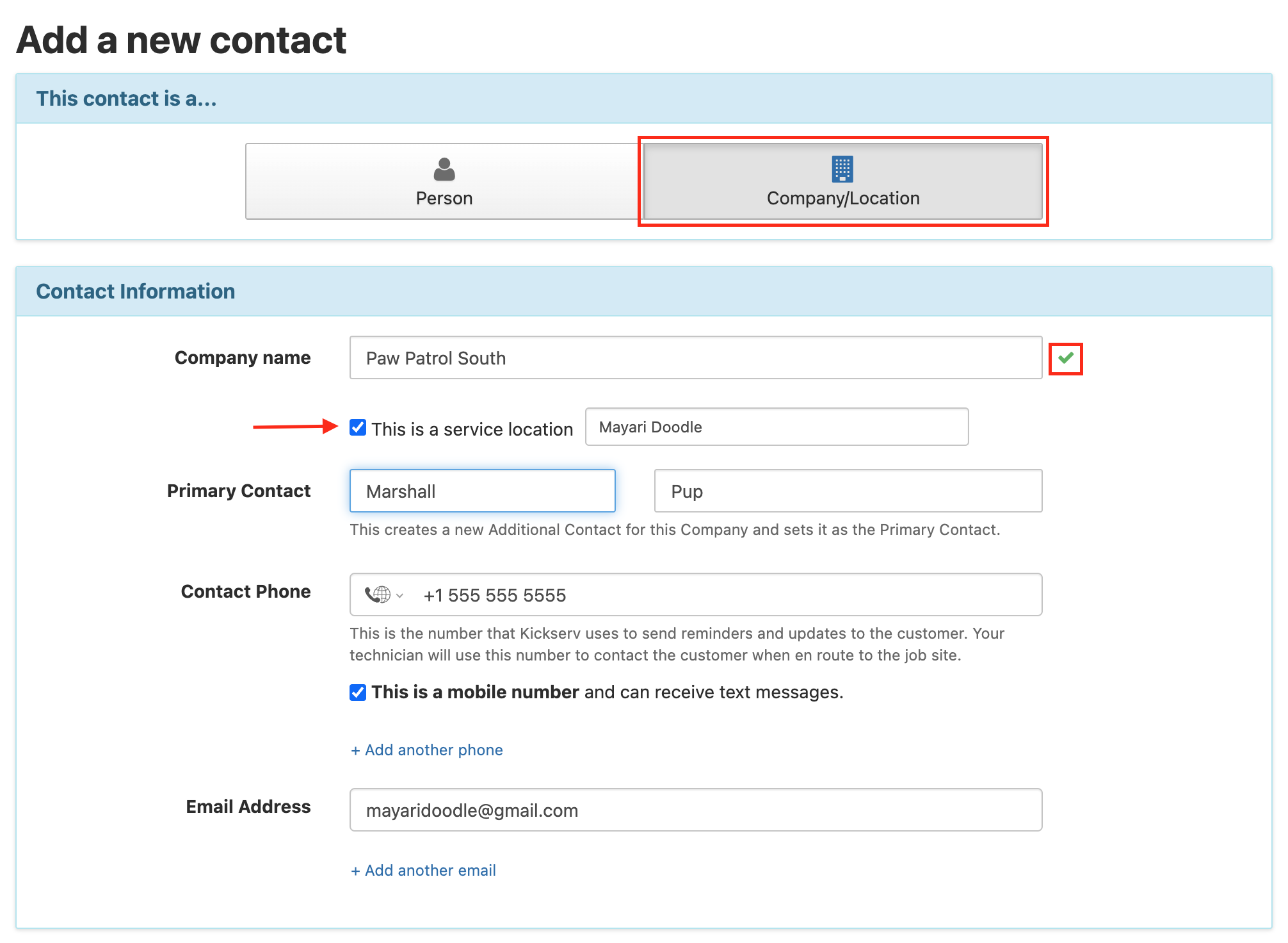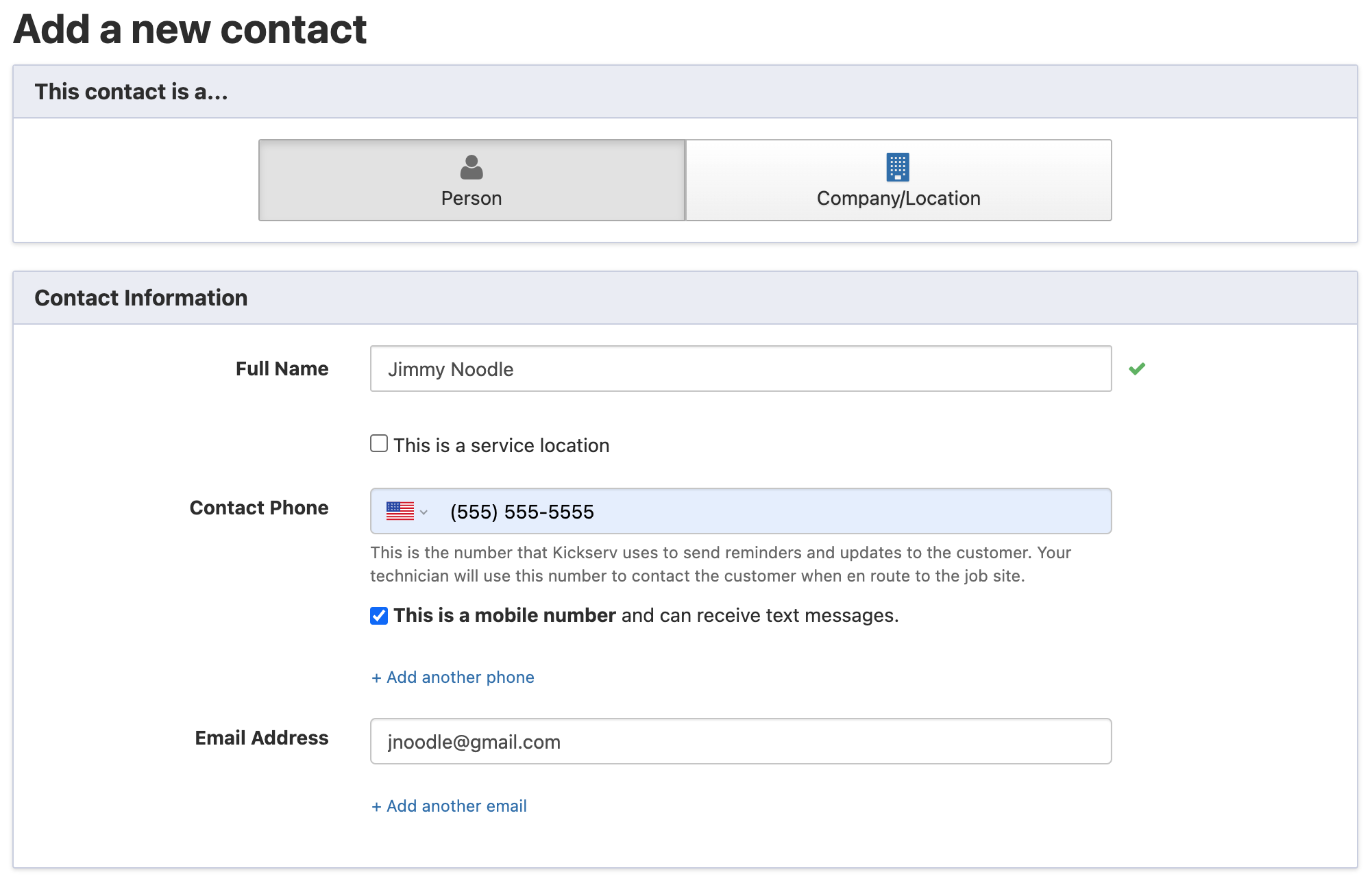 This will bring you to the Add a new contact page. From here, you can choose if this contact is a person or a company, input a customer's name, phone number, and email address. You can also check the box to ensure that they receive text messages, or if this contact should be treated as a service location. Read more about managing service locations at the bottom of this article.
