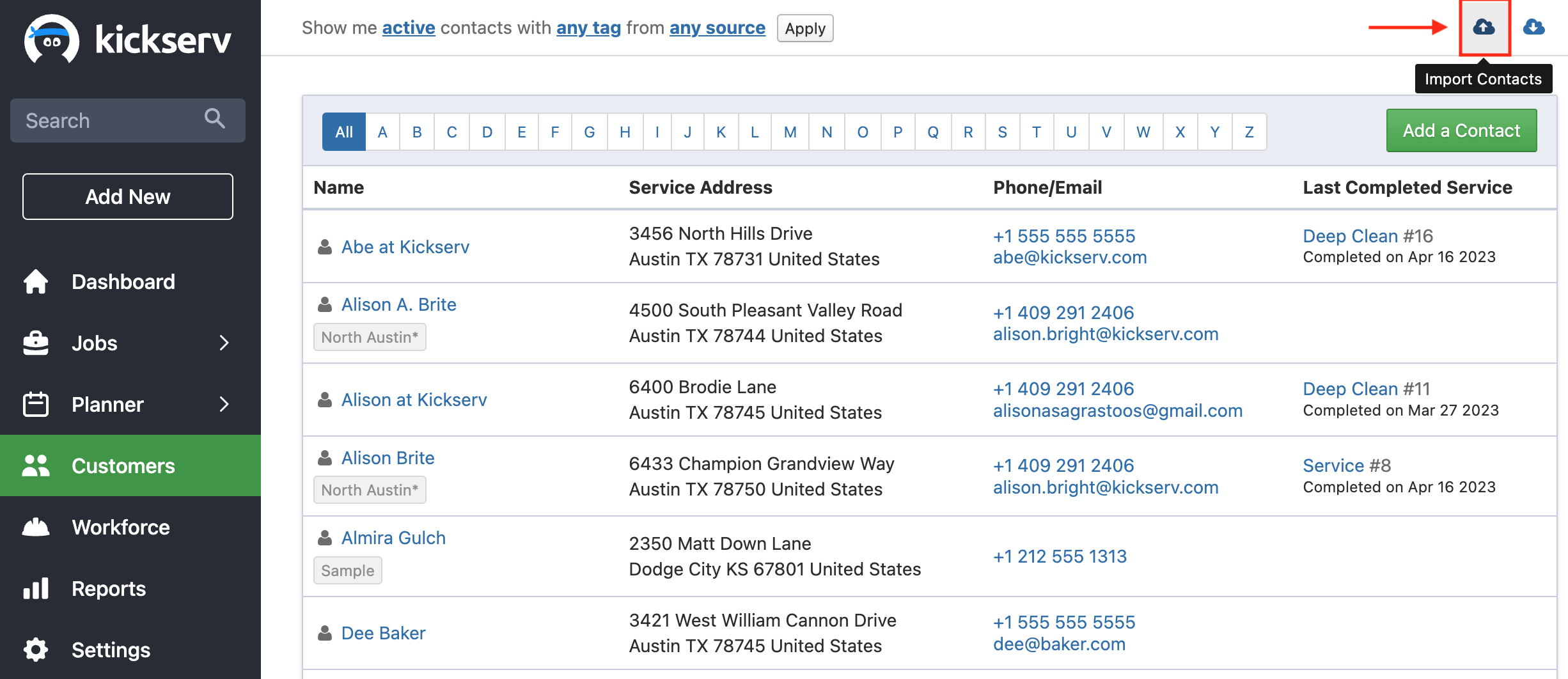 To import existing contacts to your Kickserv account, select the cloud icon with an upwards arrow.