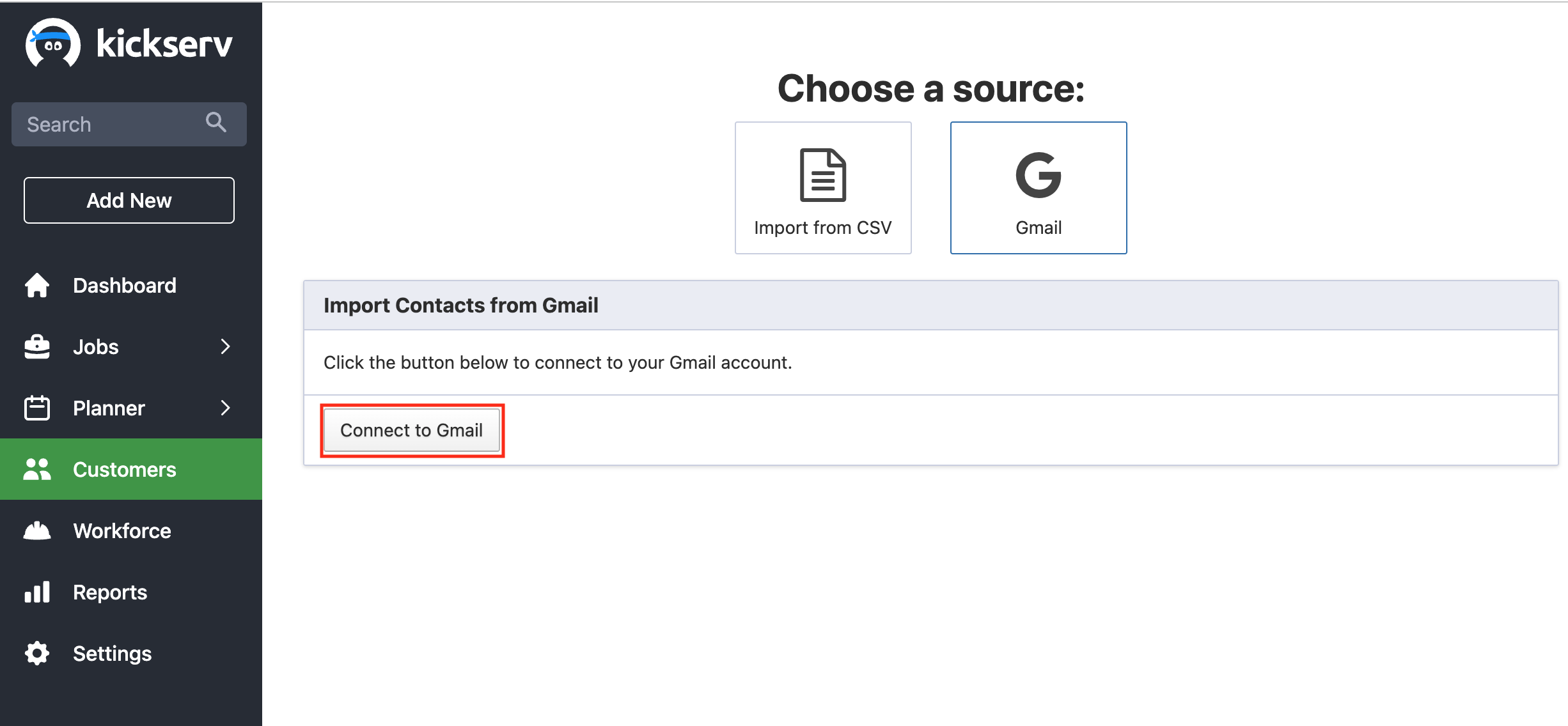 Select the Connect to Gmail button to sync your Google contacts with Kickserv.