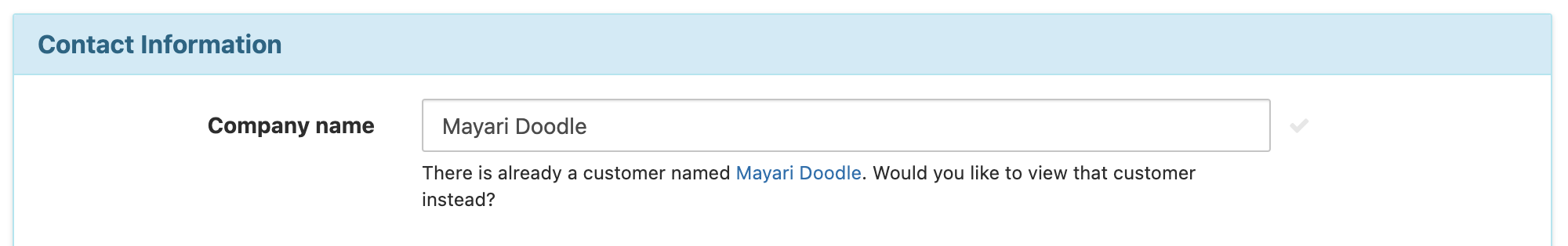 Note: You must use a unique name for the company names of service locations. Look for the green checkmark to appear confirming that this is a unique name. Otherwise, you will get a notification prompting you to go to the saved customer: