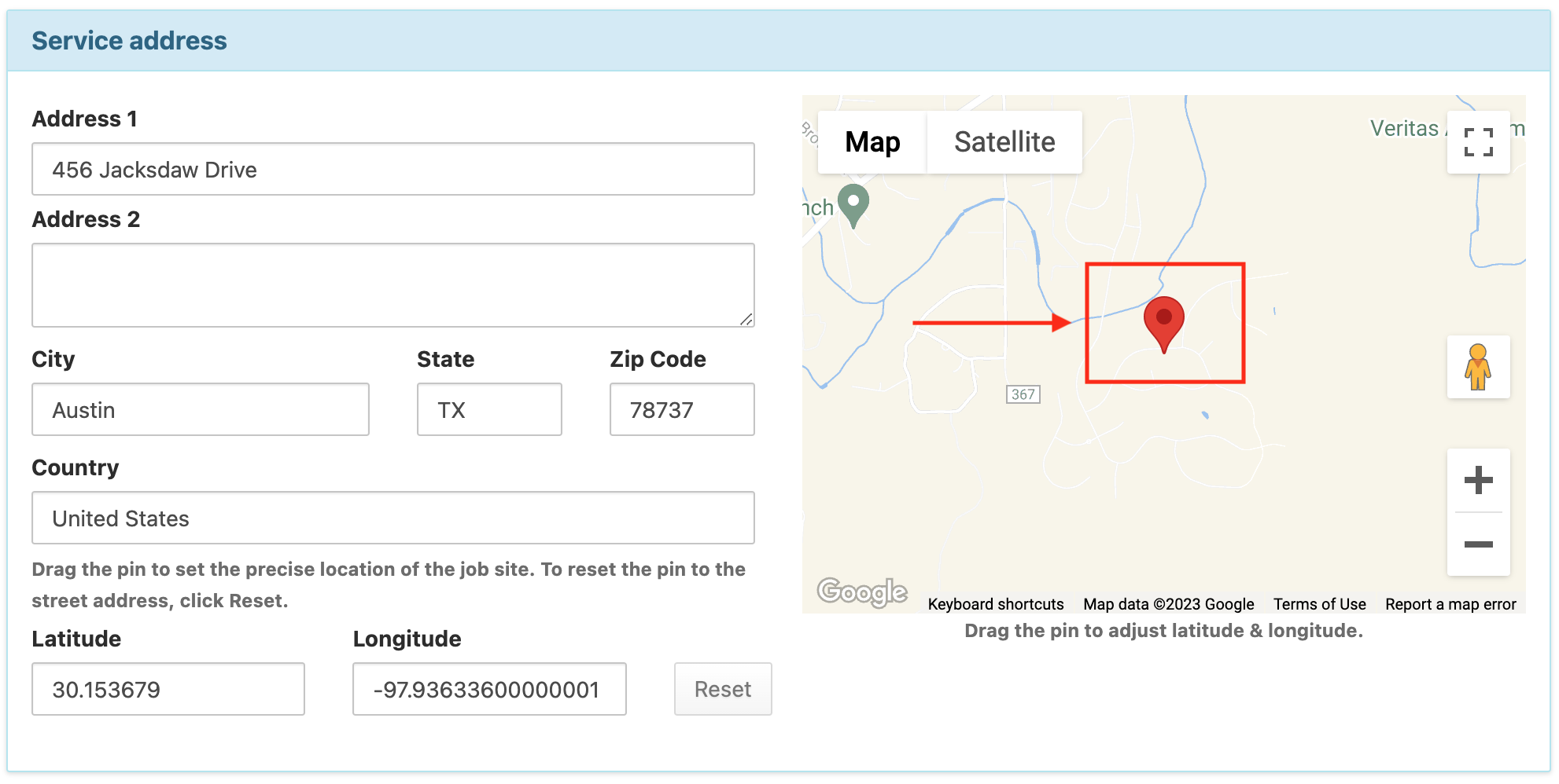 - Then, input the address for the service location. Double check that the red pin appears on the map after entering in the address to ensure it is synced with Google Maps and will work with GPS tracking.