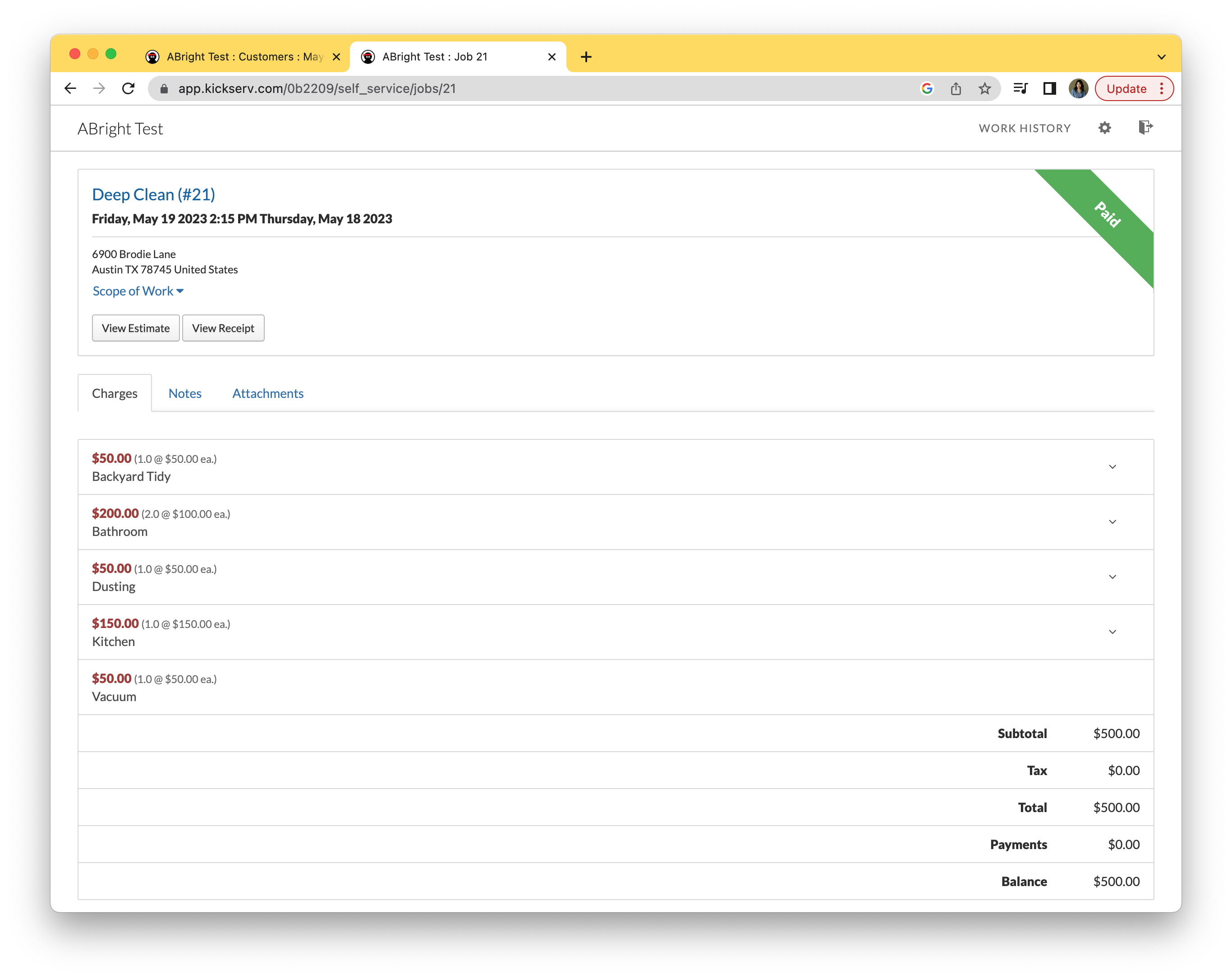 The Work History shows all of a customer's jobs—past and future. Clicking a job in Work History will reveal all the job’s details, including address and contact information, estimate, receipt, charges, notes, and attachments.
