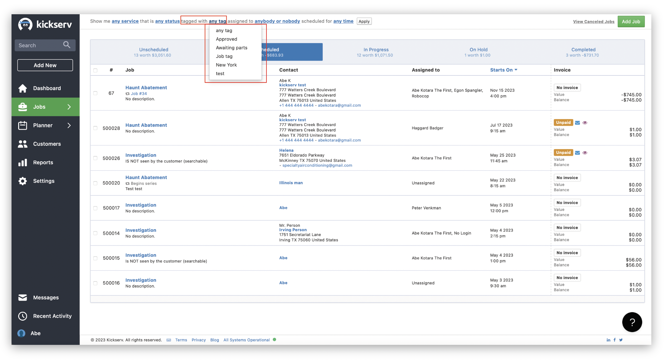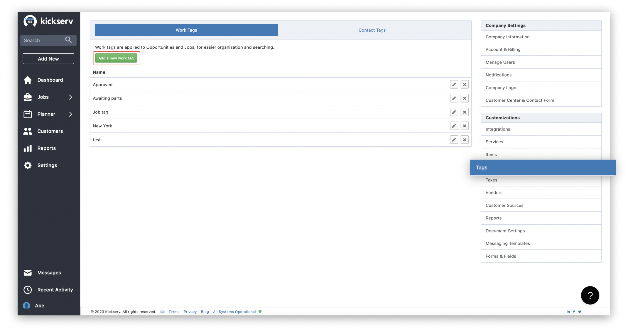 Once a tag is created, you can go back to previous Customers, Opportunities, and Jobs to organize and categorize your Kickserv account.