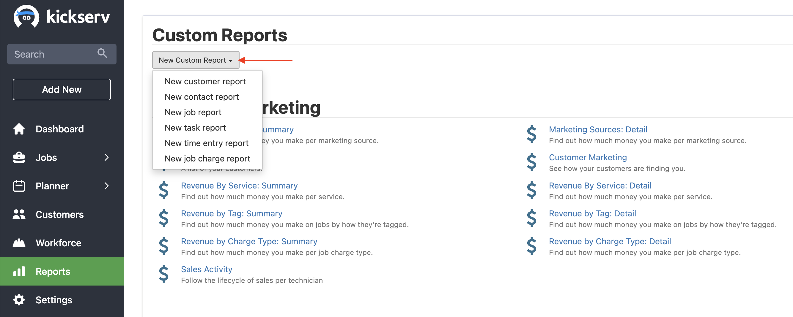 - Select the drop down arrow next to New Custom Report to choose the report type you'd like to build.