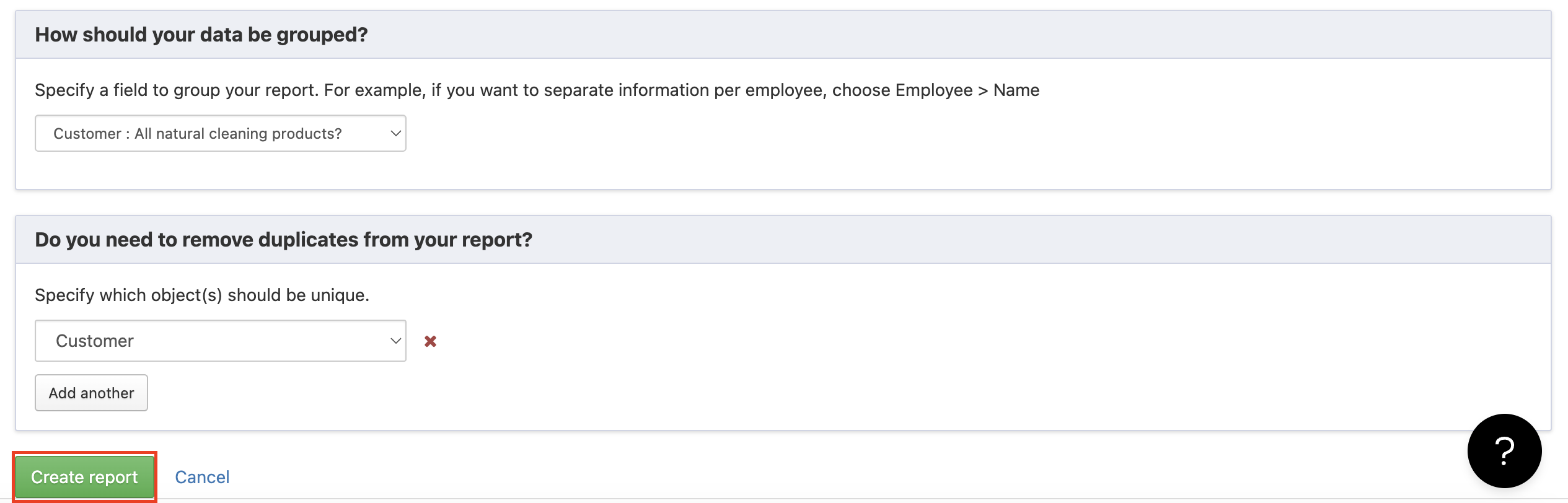 - Under Do you need to remove duplicates from your report?, select which value(s) should be unique to prevent or remove duplicates.